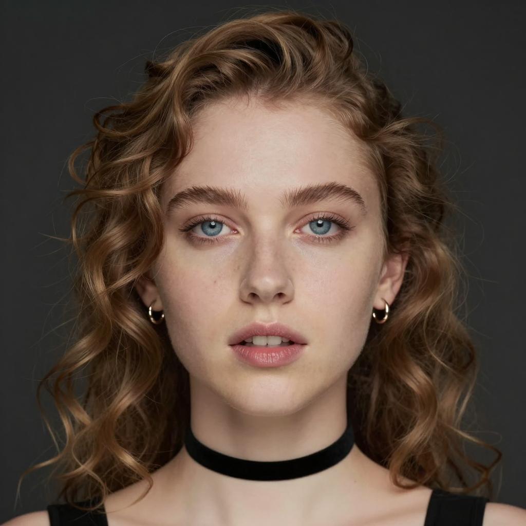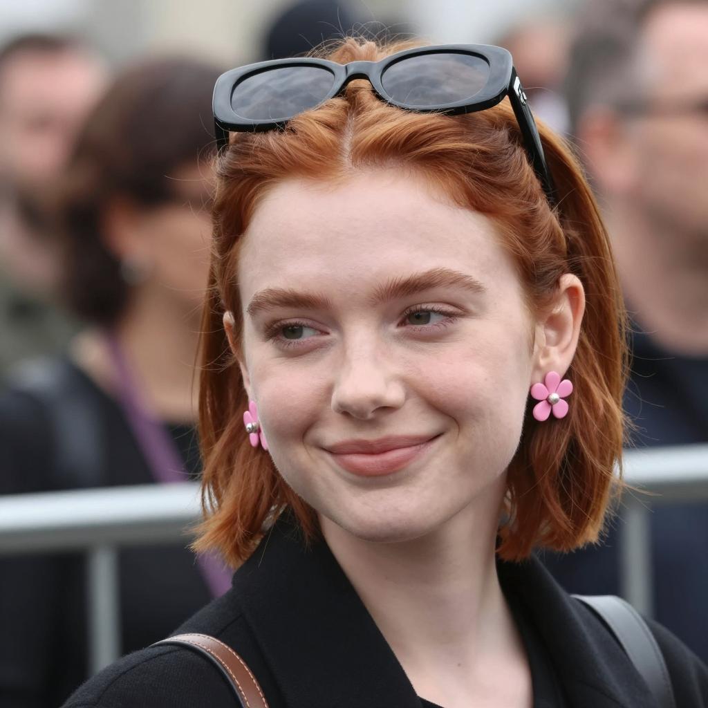 Photograph of a young woman with short red hair, wearing black earrings, black jacket, and glasses on her head. She has fair skin and a neutral expression. Background includes blurred people and metal railings. Casual urban setting.