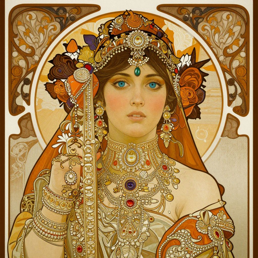 Art Nouveau-style digital illustration featuring a central black-robed woman in ornate dress, surrounded by six figures in vintage attire, each with halos