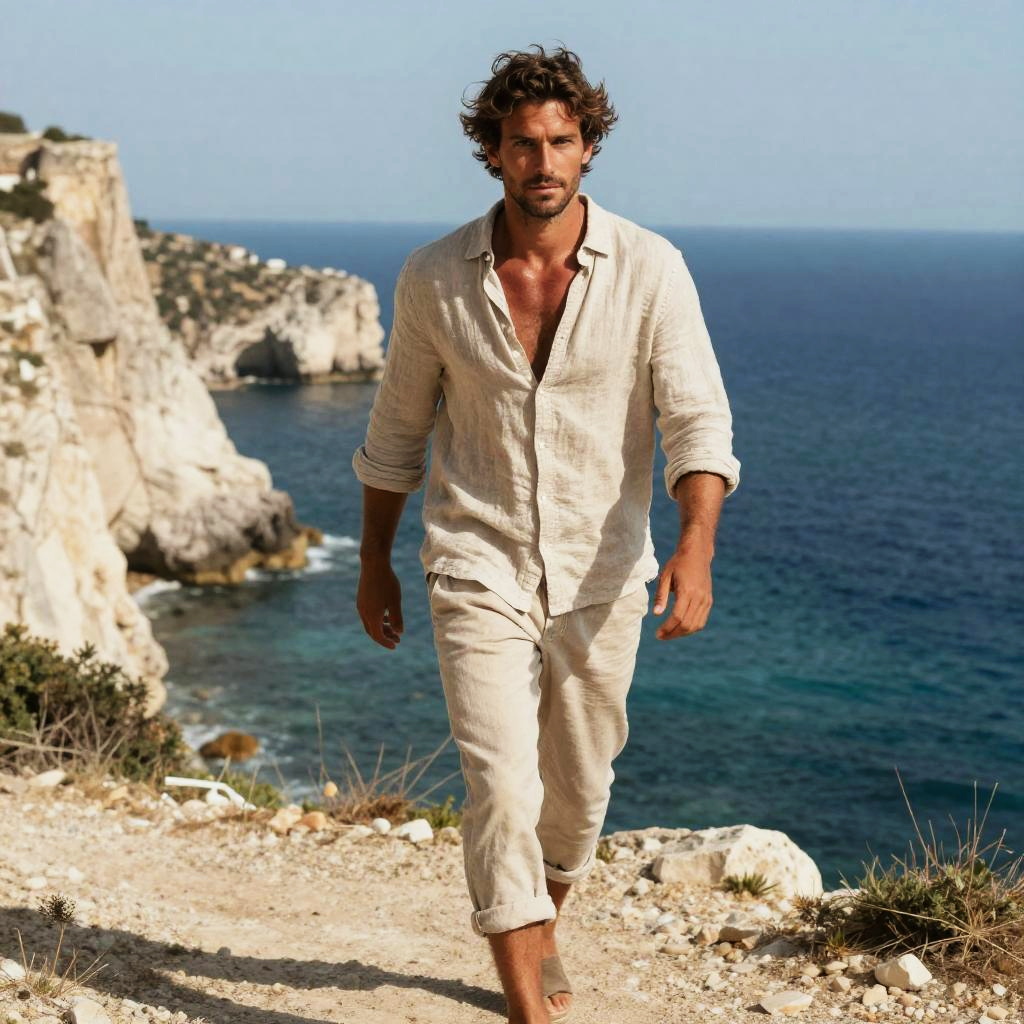 Sexy Italian man walking along a dramatic coastline in Italy, wearing a linen shirt and rolled-up trousers, sun-kissed skin and piercing eyes, windswept hair, with cliffs and turquoise Mediterranean sea behind him, romantic and natural atmosphere