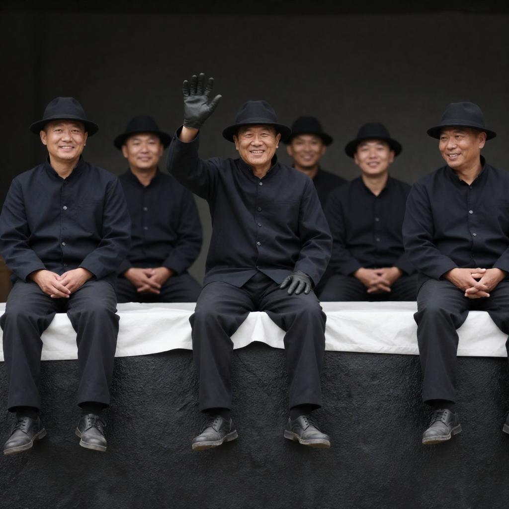 Photograph of six men in dark clothing and hats, sitting on a rough, black, ured wall with white sheets. One man raises his gloved hand. Smiling faces. Background is blurred and dark. Five men on the right, one in the center.