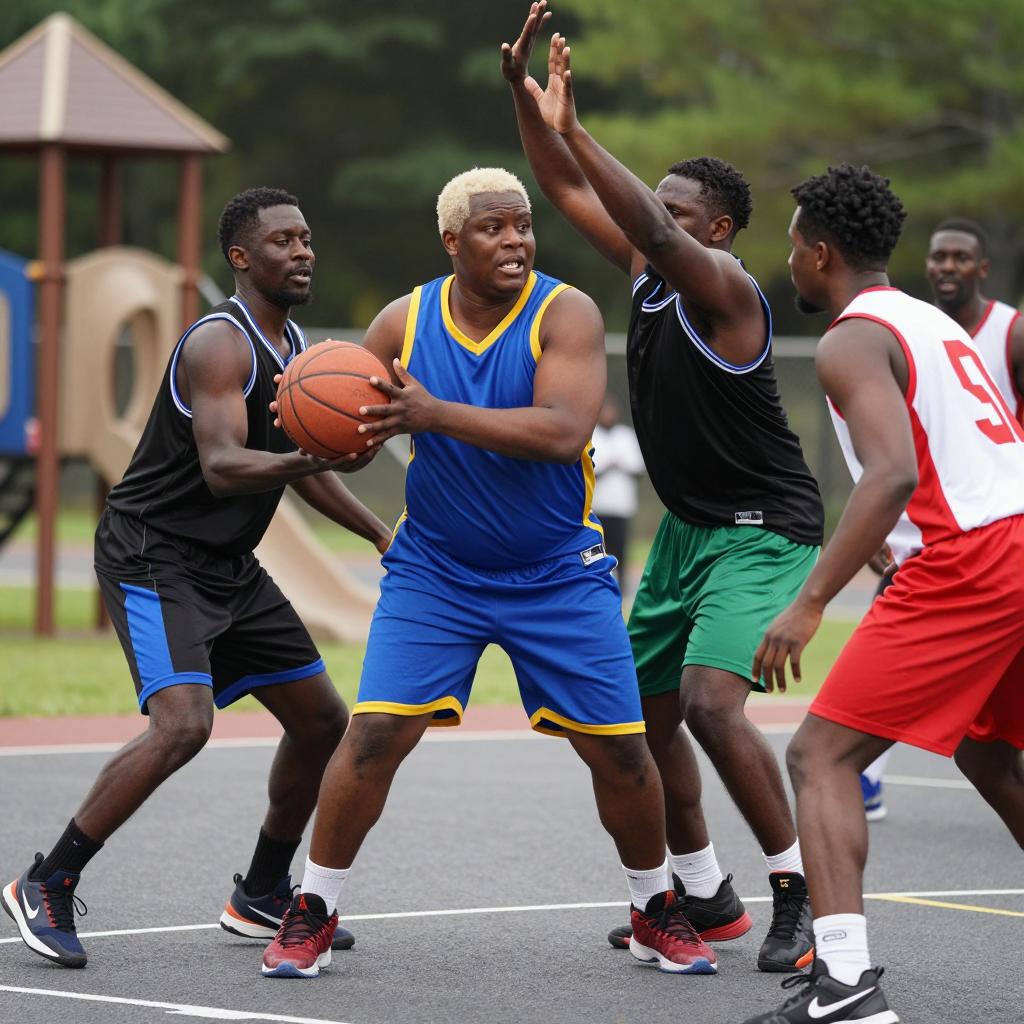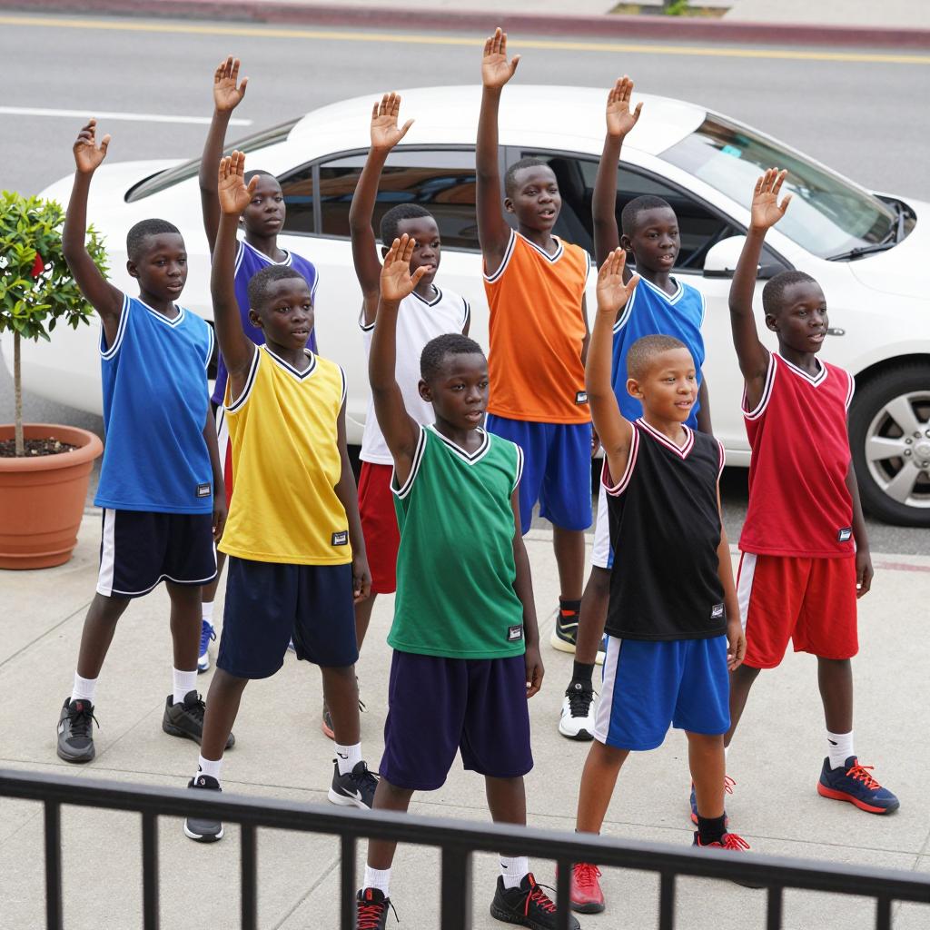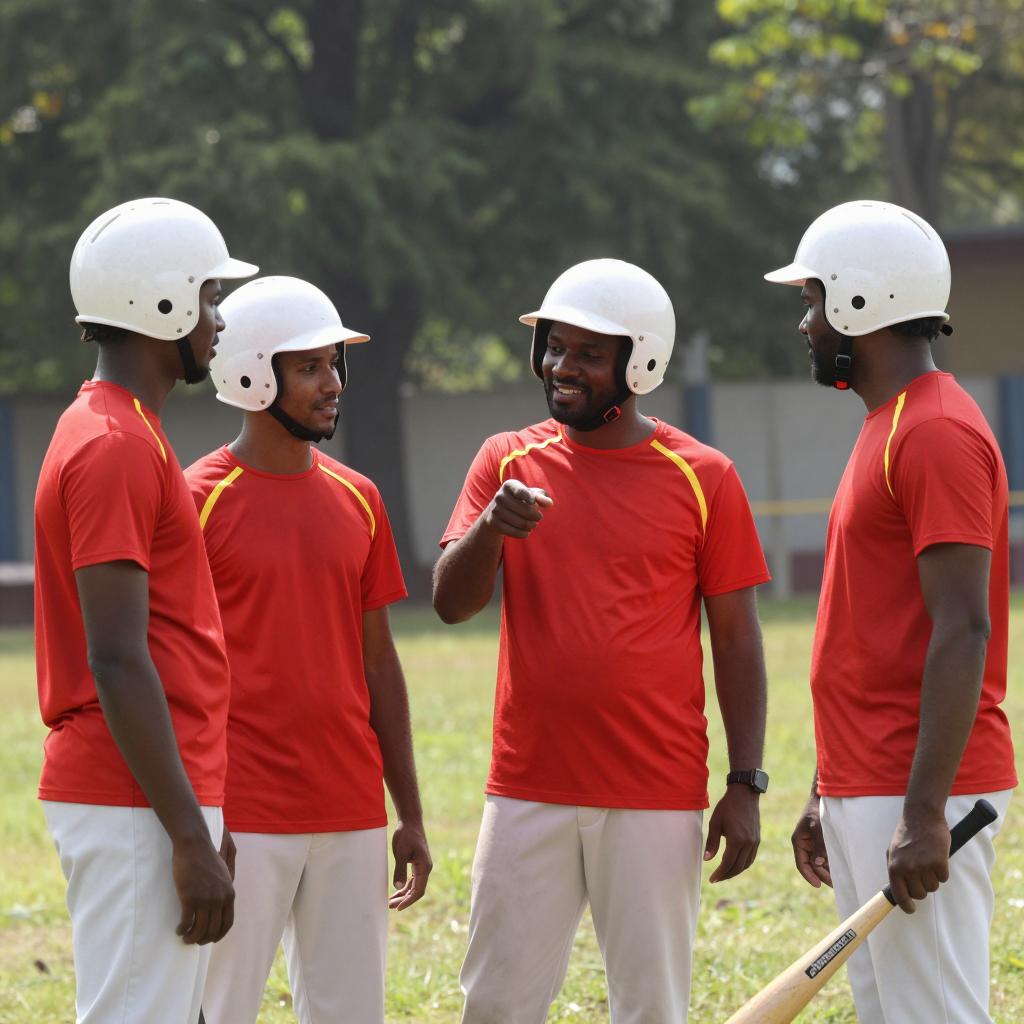 Four men in bright red shirts with yellow stripes and white helmets, standing outdoors on green grass. Three men on left and right, one man in center. Man in center smiling, pointing with right hand. Man on far right holding wooden bat, wearing black headband. All men have dark skin. Background with green trees. Sunlight illuminating scene.