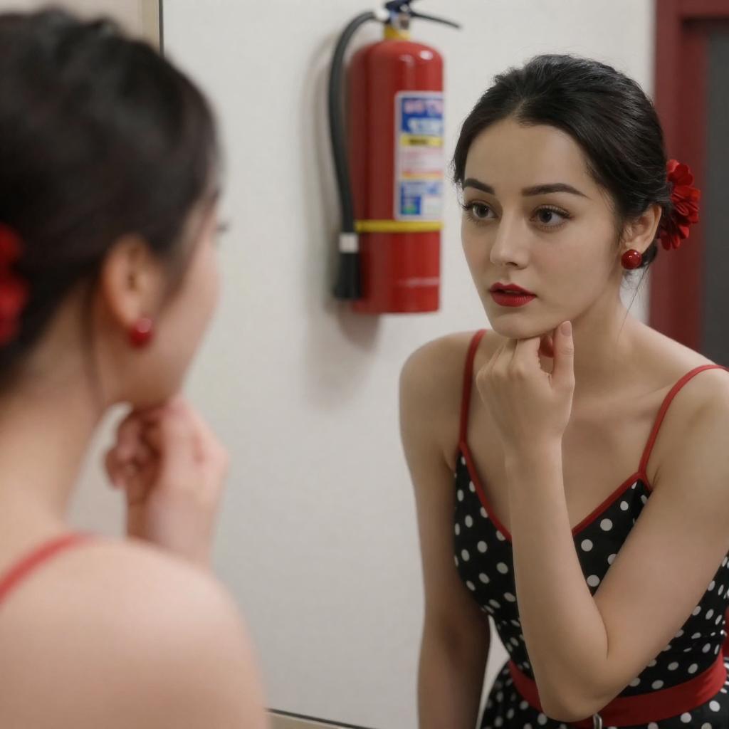 Photograph of two Asian women with long black hair. Both wear red sleeveless tops and one has a red beret with a blue, white, and red stripe. The woman in the beret leans close to the other, who looks down. Mirror reflection shows the woman in the beret from the side. Background: tiled wall, colorful hanging fabric. Intimate, focused interaction.