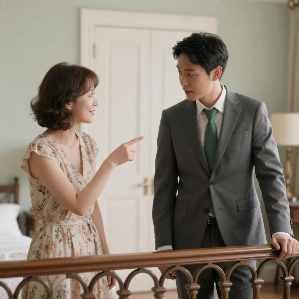 Photograph of a woman in a white nurse uniform with a short bob haircut, gently touching the face of a man in a maroon bathrobe. They stand in a room with a fireplace, framed pictures, and a vintage TV. The woman's expression is caring, while the man looks surprised.