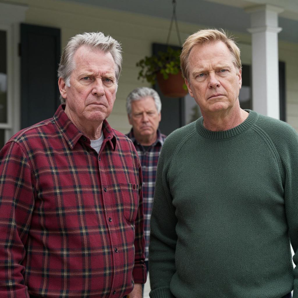 Portrait of three serious men wearing yellow raincoats standing in front of an American flag. The group includes an African-American man on the left, a middle-aged white man in the center with his hood up and a white scarf around his neck, and an older white man on the right wearing a black beanie. The photo conveys a somber and unified tone.