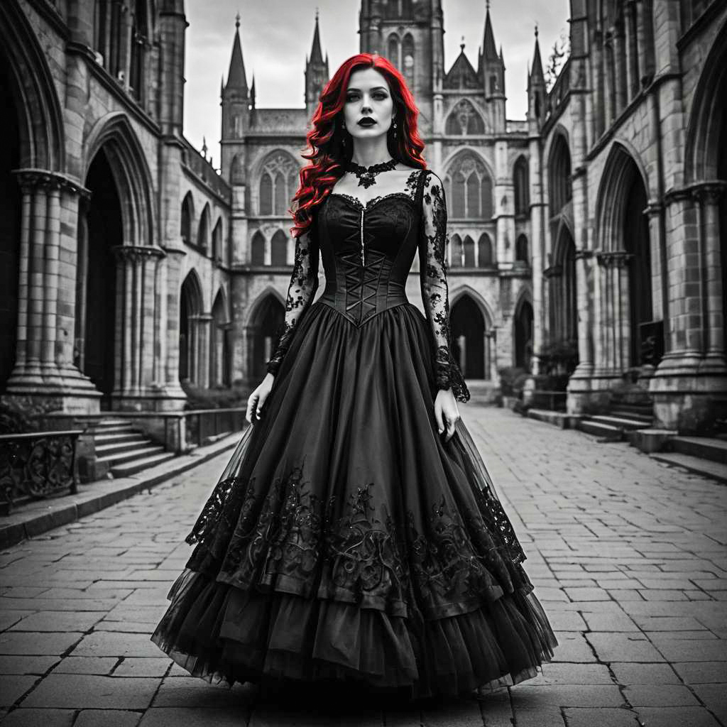 Photo of a Round woman, Long Waves, rbd outfit, red and black dress with gothic style, lace details, corset top, Tulle fabric, knee-length with dramatic flair, dark elegance, Charcoal Black accents, Ballet Flats, Gothic Cathedral, STYLE:black and white film