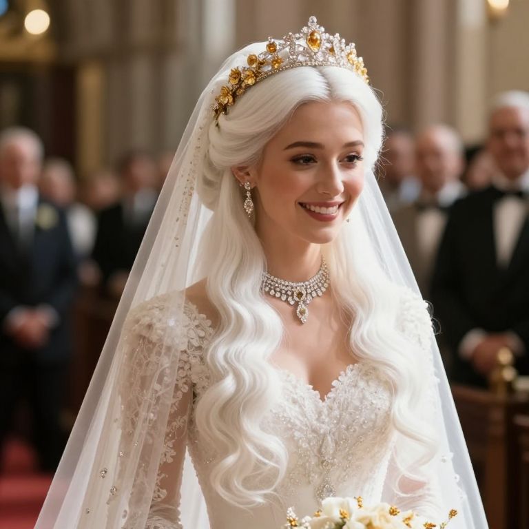 A beautiful bride with long, flowing white hair wearing a traditional wedding gown, styled in a majestic crown bridal hairstyle with golden floral elements woven into the hair, standing in a sunlit cathedral aisle during a royal wedding ceremony, her face glowing with joy and innocence, soft golden light reflecting off her diamond choker and veil.