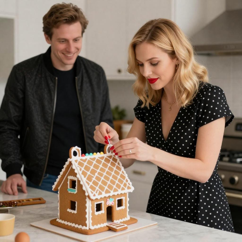 Photograph of two people in a kitchen. A woman with blonde hair in a black, polka-dotted dress, and red lipstick, decorates a large, detailed gingerbread house with icing. A smiling man in a black, floral-patterned jacket watches. The gingerbread house has colorful, intricate designs and a white, frosted roof. Kitchen background with cabinets and a stove. Woman focuses on her work, man stands to the left.