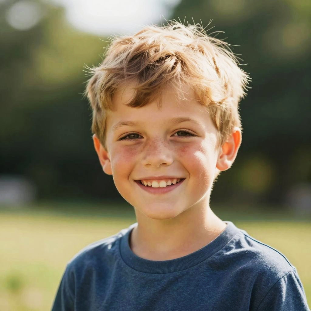 Photograph of a smiling young boy with wavy blonde hair, wearing a colorful striped sweater, at a brightly lit nighttime carnival.