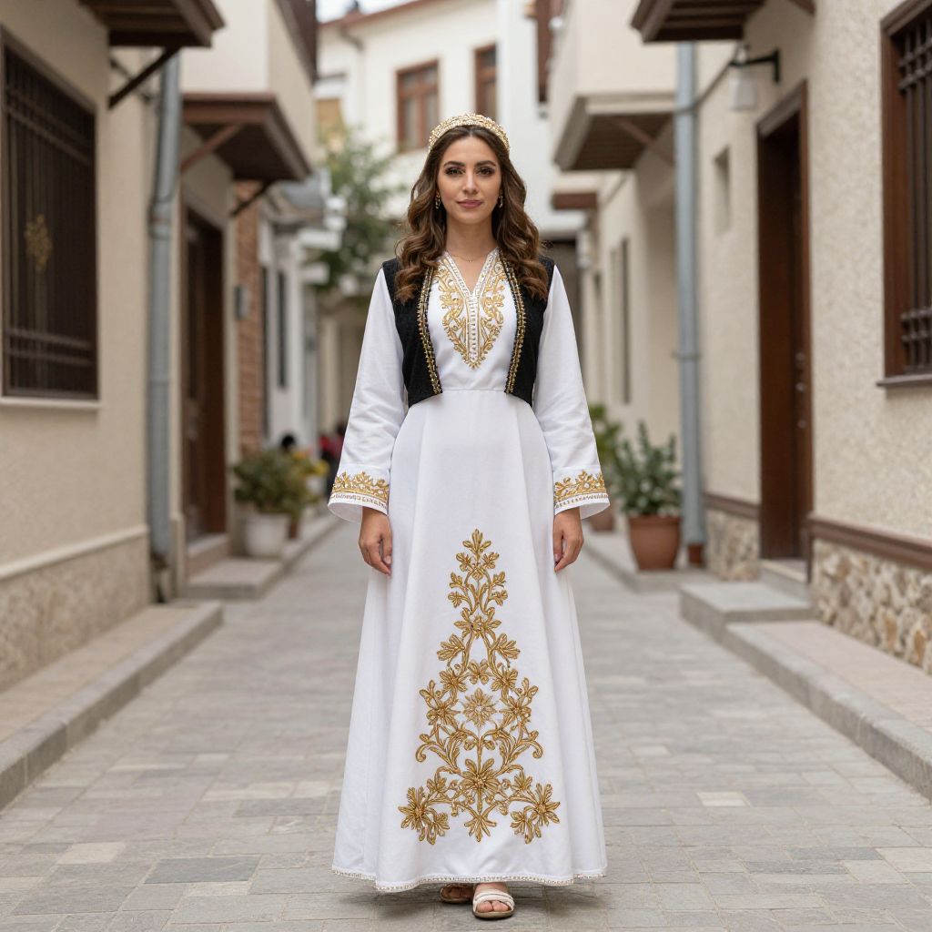 Turkish Traditional Female Costume, woman in a white dress standing in a narrow alleyway
