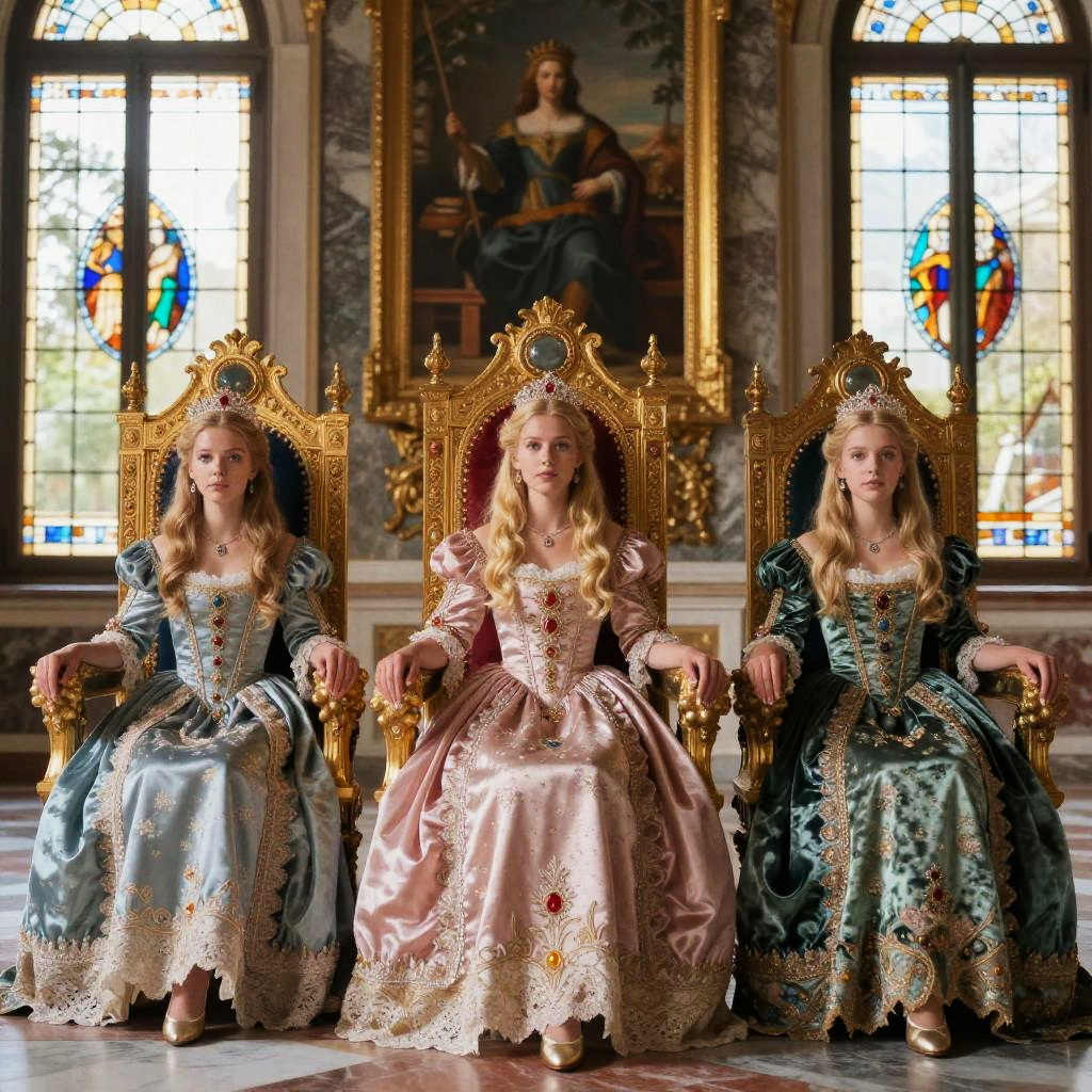 Blonde princesses seated on royal thrones adorned with jewels, wearing delicate lace and velvet, inside a grand palace with marble floors and stained glass windows, Renaissance art vibe