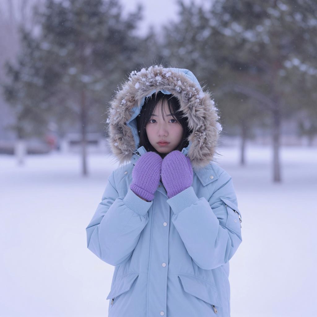 Portrait of a teenage girl standing outdoors in a snowy winter setting during dawn. She is wearing a light blue hooded down jacket with a fur-lined hood and purple knitted mittens. Snowflakes fall gently around her, with a backdrop of snow-covered pine trees and ground, creating a serene and tranquil icy blue and lavender ambiance.