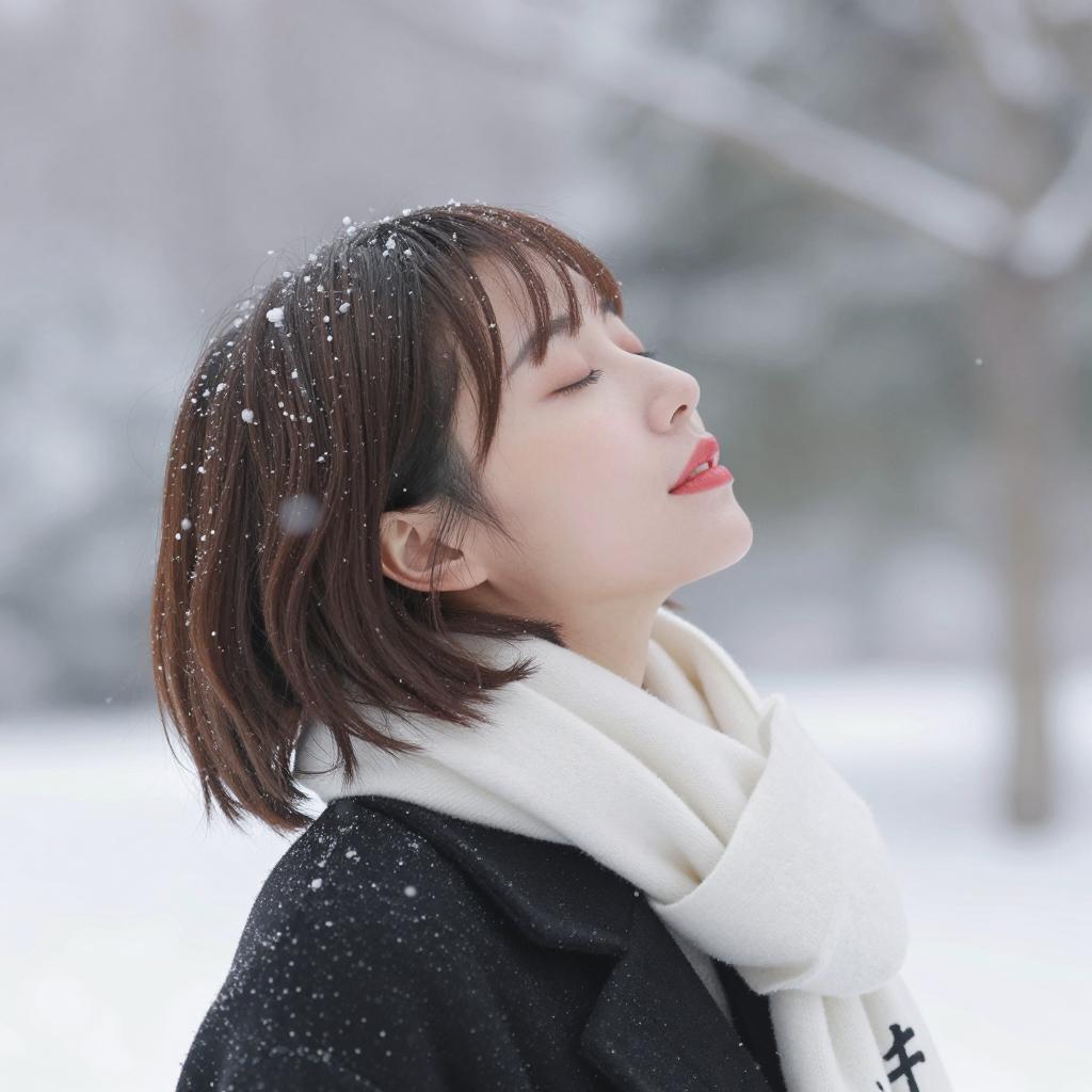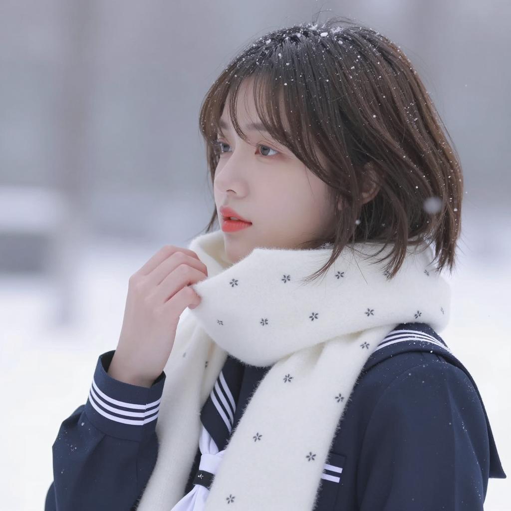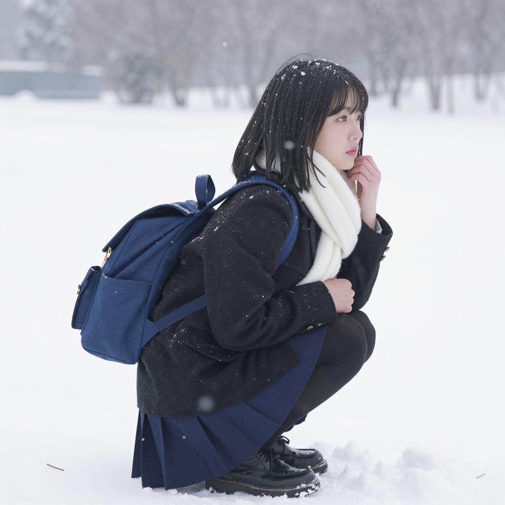 Portrait of a teenage girl standing outdoors during a snowy winter dawn. She is wearing a light blue hooded down jacket with a fur-lined hood and purple knitted mittens. Snowflakes gently fall around her while soft white snow covers the ground and pine trees in the background. The scene captures a serene and tranquil icy blue environment with soft lavender hues.