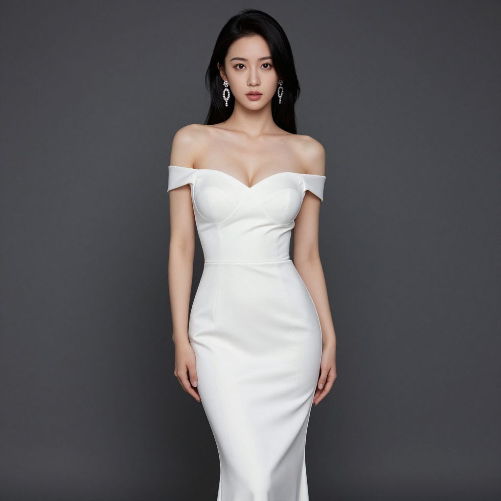 Photograph of an Asian woman with long black hair, wearing a white off-shoulder satin dress, standing against a dark gray background.