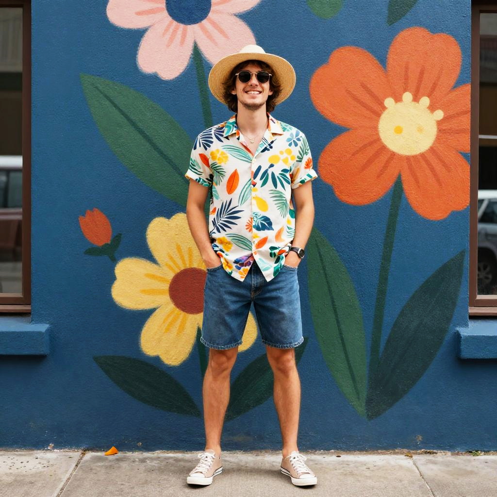 A cheerful artistic man stands confidently in front of a vibrant, floral mural on a street, displaying a relaxed summer vibe with his colorful attire.