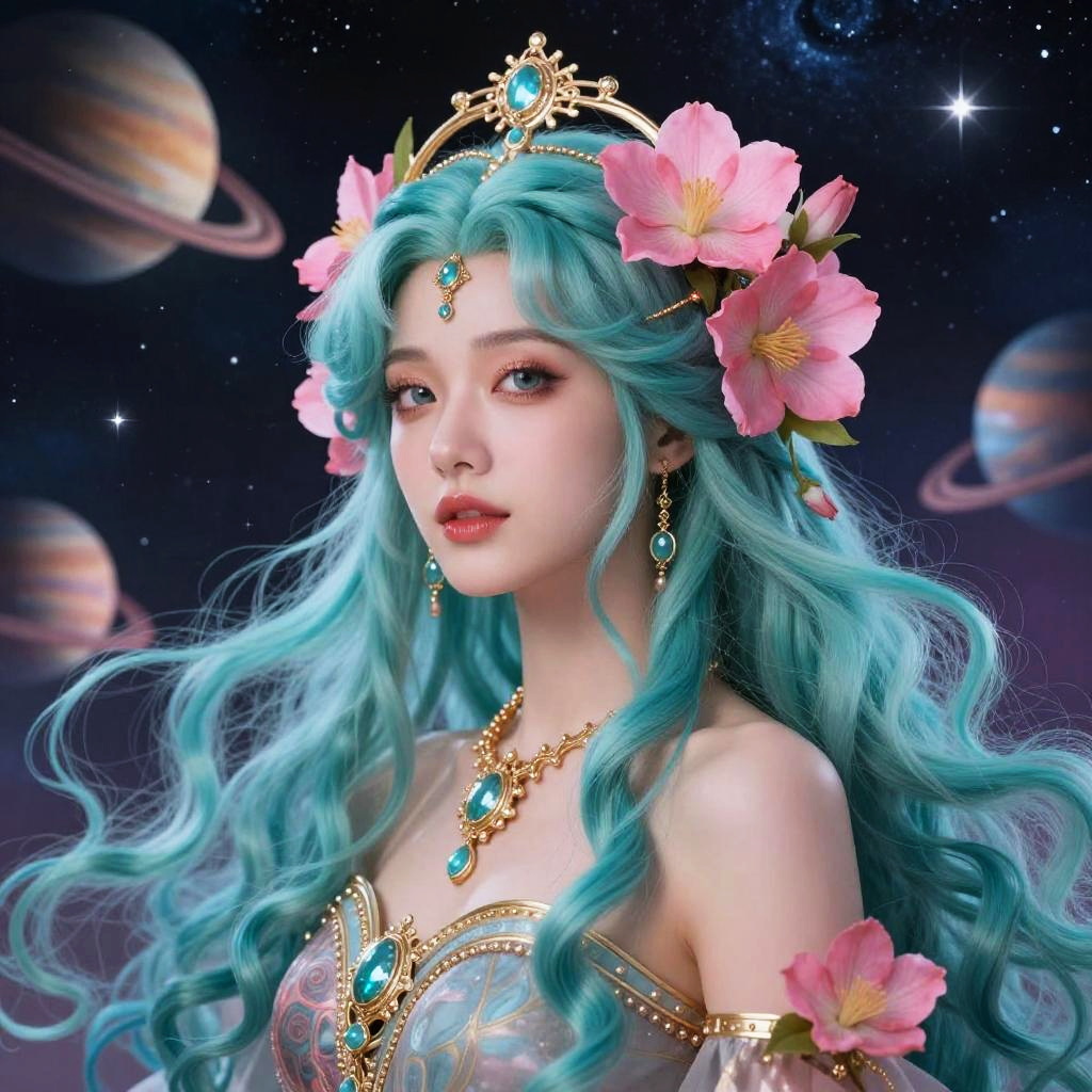 Digital artwork of a fair-skinned, ethereal woman with long, wavy turquoise hair adorned with pink flowers. She wears a gold tiara with a central turquoise gem, matching earrings, a necklace, and an off-shoulder dress with intricate gold and turquoise patterns. Her red lips and delicate features are highlighted against a cosmic backdrop with planets and stars. Her expression is serene, and her gaze is directed slightly to the right. The image has a fantasy, otherworldly vibe, with vibrant colors and detailed textures.