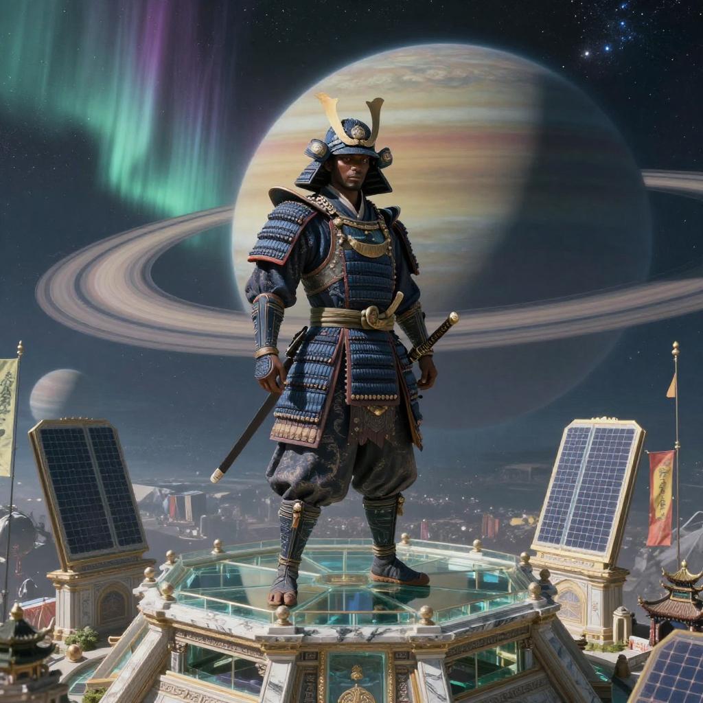 Modelshoot style, (extremely detailed CG unity 8k wallpaper), full body shot of celestial samurai warrior, glass-and-marble rooftop solar temple on an orbital ark above a ringed gas giant, panoramic starfield, auroral solar-wind streaks, transparent terraces and floating prayer banners, professional majestic oil painting by Kehinde Wiley and H.R. Giger, Studio Ghibli, trending on ArtStation and CGSociety, intricate, high detail, sharp focus, cinematic lighting, photorealistic art by midjourney and Greg Rutkowski