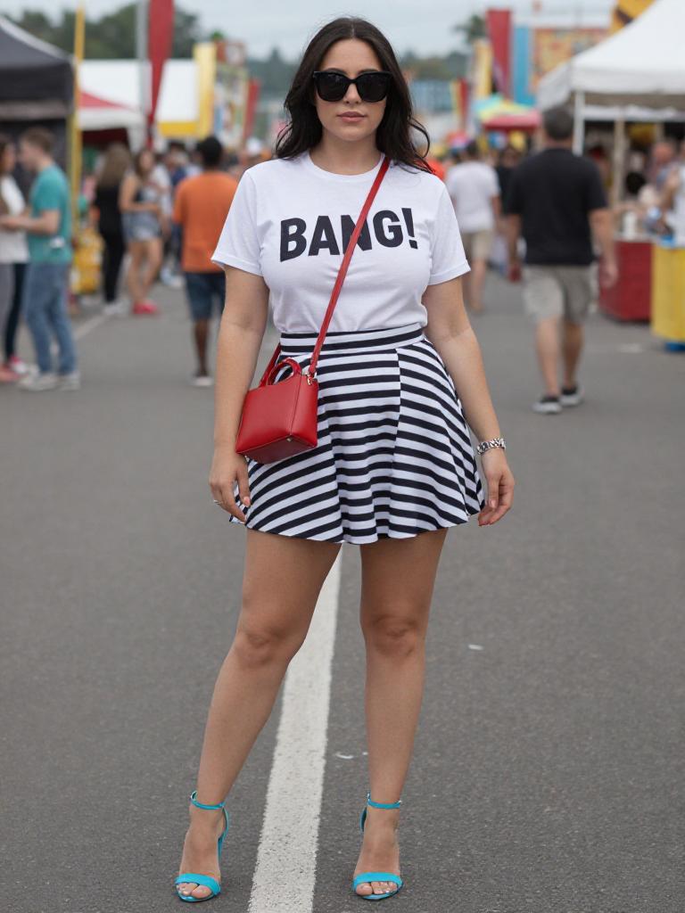 A busty woman in a casual chic outfit featuring a white graphic t-shirt with a BANG! print and a black and white striped flared skirt stands at a vibrant street carnival parade route, accessorized with a red crossbody bag, black sunglasses, and teal ankle-strap heels. Visual style: cameraphone. Sexy. Pretty face and beаutiful eyes. Big breasts