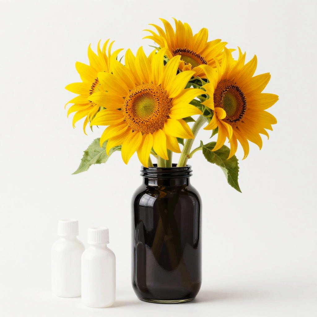 A bold high-contrast digital painting featuring a glossy jet black glass jar holding a sprig of bright yellow sunflowers, on a seamless white background with three small empty white bottles nearby; high contrast, bold accent colors, thin clean lines, balanced composition, generous negative space, soft studio lighting, modern minimalist aesthetic, crisp edges, no text, no watermark