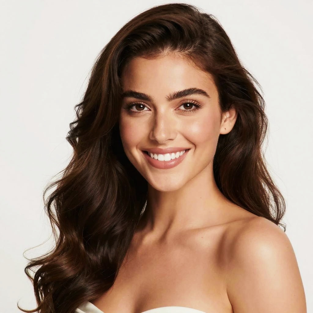 Photograph of a young woman with long, wavy brown hair and fair skin. She has dark, arched eyebrows, brown eyes, and is smiling with white, even teeth. She is wearing a strapless white top, revealing her shoulders and collarbone. The background is completely white, making her the sole focus of the image. Her hair is styled to one side, and her makeup is natural, emphasizing her clear skin and bright eyes. The lighting is even, highlighting her cheerful expression. The image is sharply focused and vibrant.