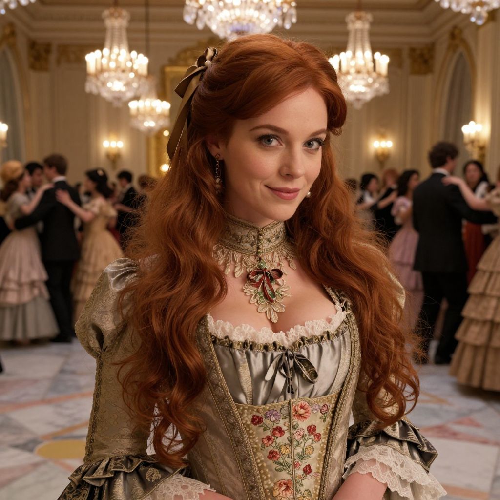 Photograph of a red-haired woman in elaborate Victorian-era gown with lace, embroidery, and jewelry, smiling in a grand, chandelier-lit ball