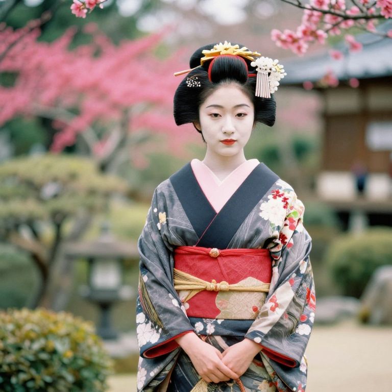 Organized a geisha in a Japanese garden, film photography, helios 44-2 lens, swirly bokeh, spring colors, Kurosawa style,