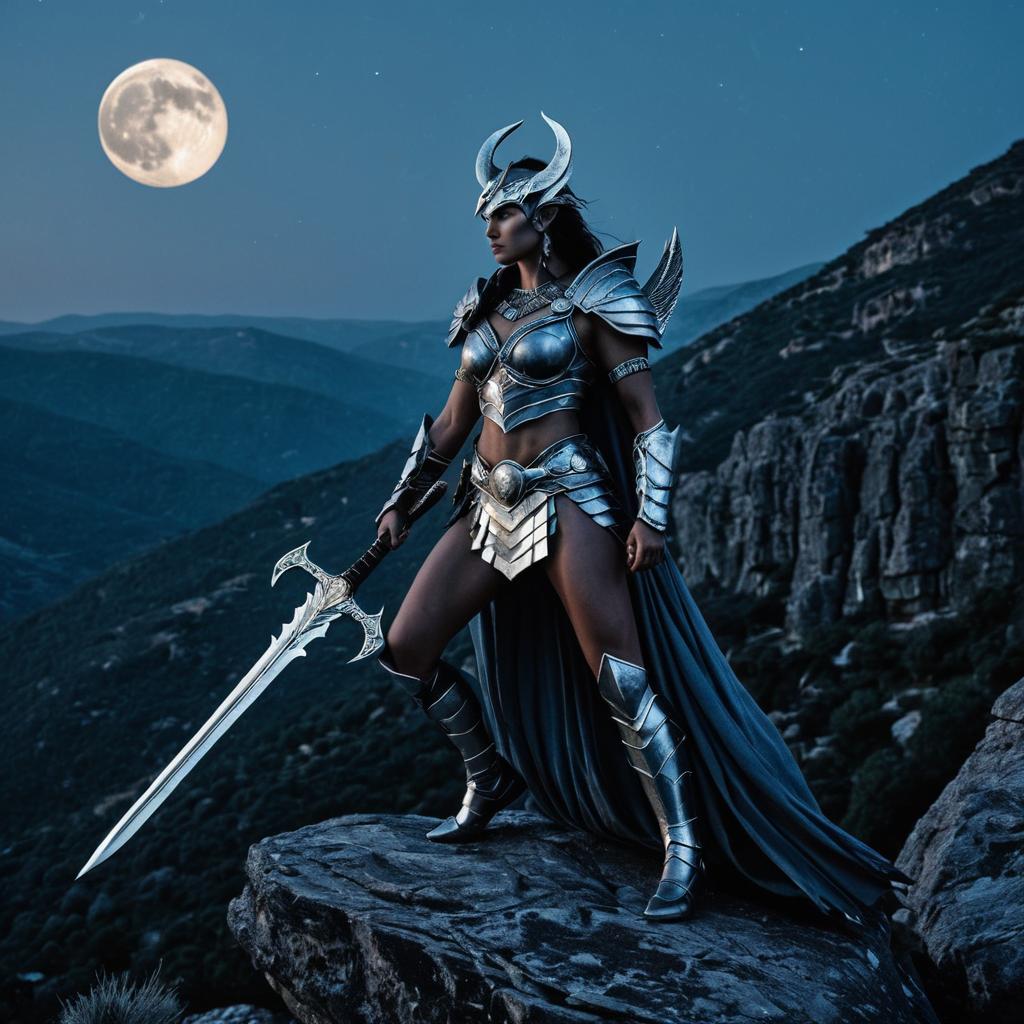 Artemis – Goddess of the hunt and the moon, portrayed as an enigmatic goddess draped in nocturnal robes blending into the shadowy nightscape with piercing predatory eyes, standing in a mist-thickened moor alive with flickering willow wisps beneath a crescent moon.