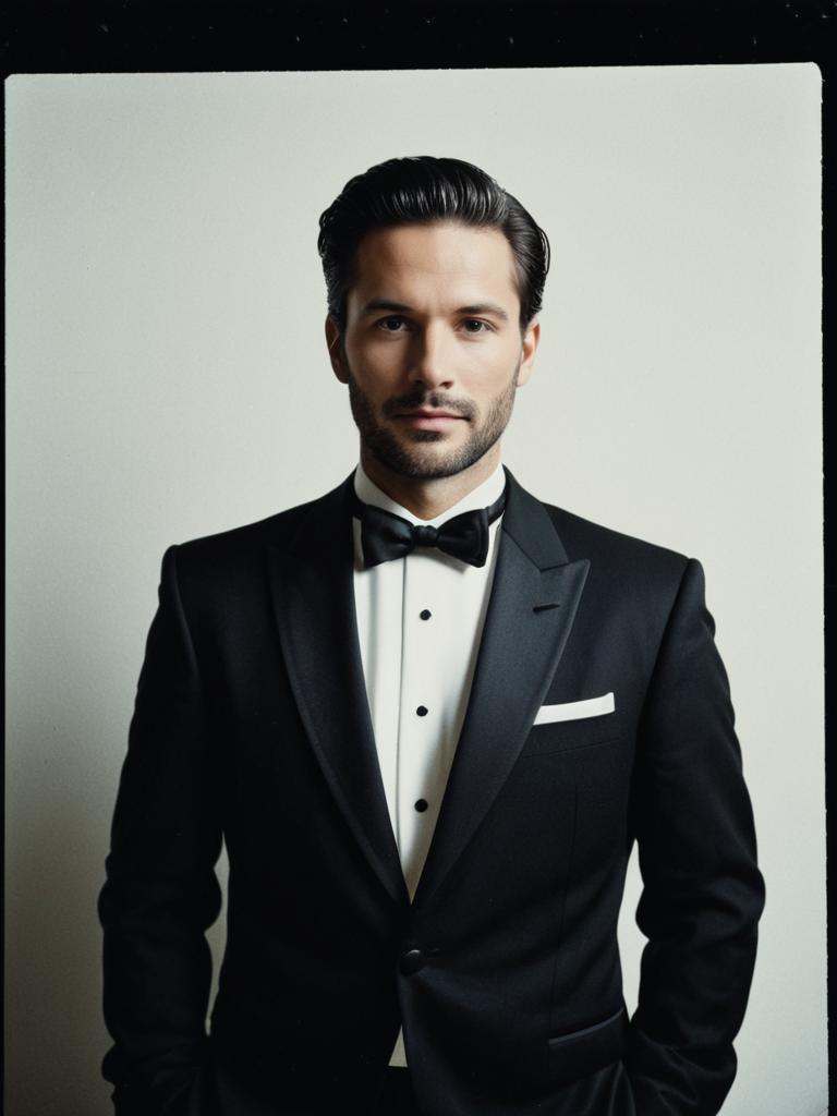 Man in Wedding Tuxedo, photorealistic formal fashion portrait, cinematic realism