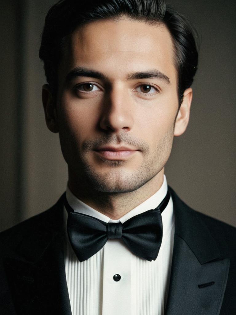 Photorealistic portrait of a young Caucasian man wearing a classic black wedding tuxedo with satin lapels, white dress shirt, black bow tie, and a white pocket square. The man has dark slicked-back hair and a trimmed beard, posing confidently against a plain light background. The image captures a formal, cinematic fashion style.