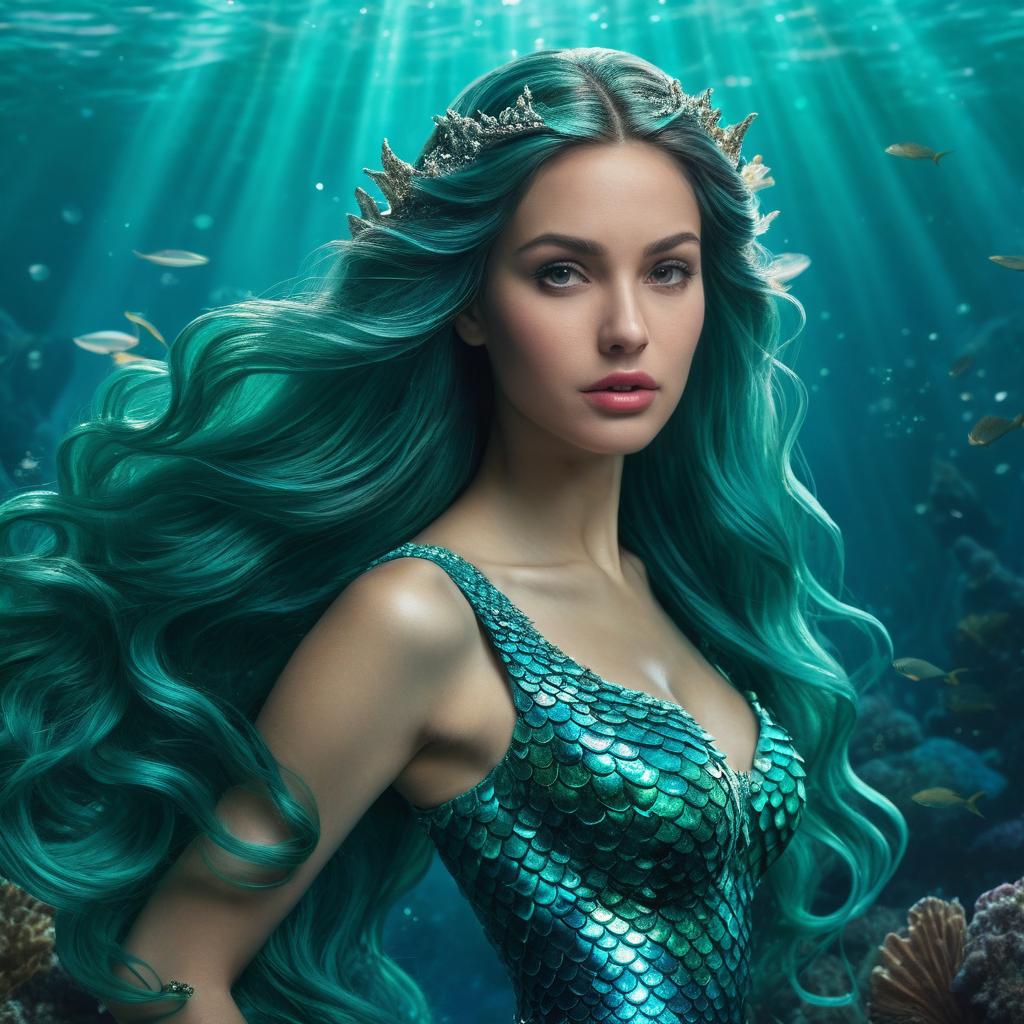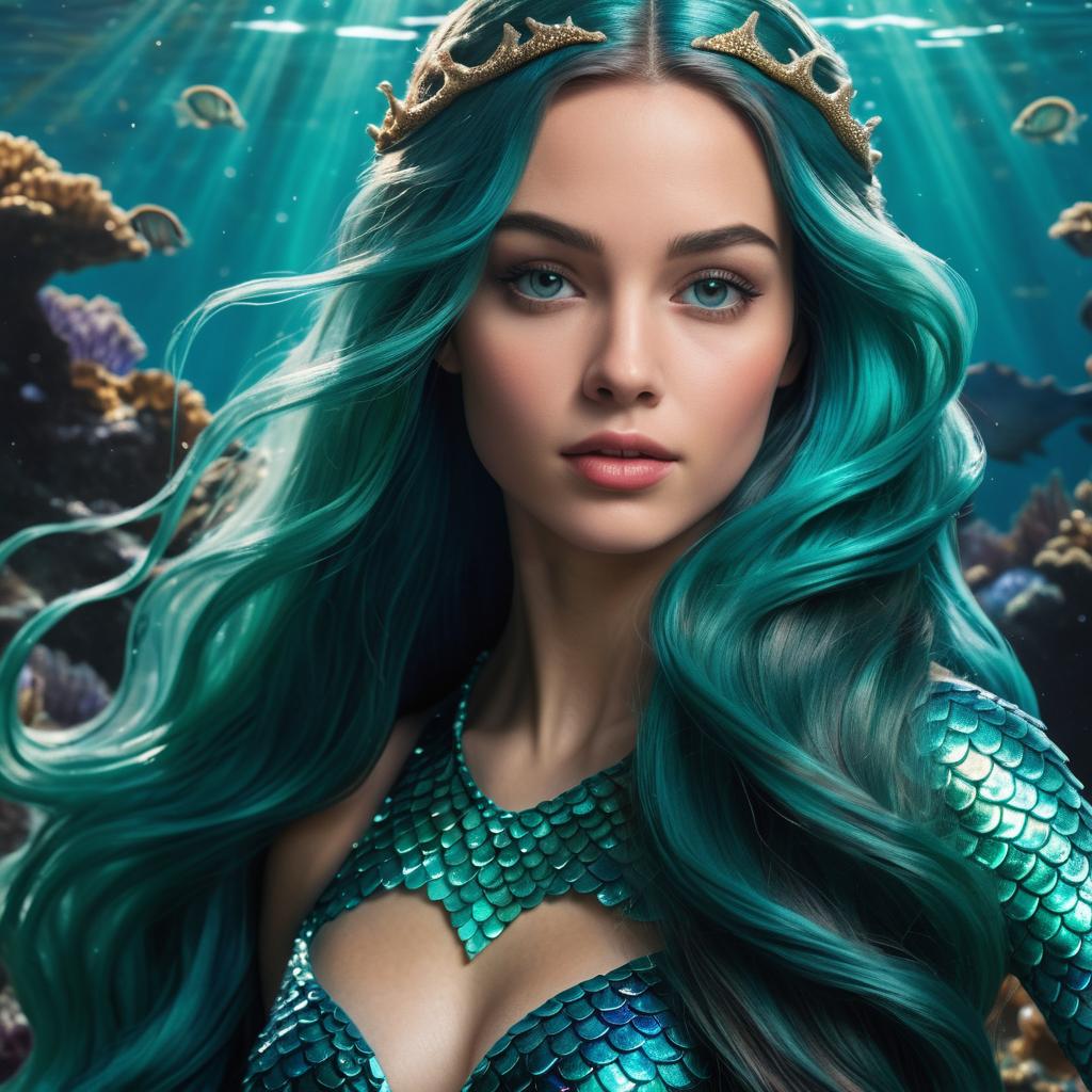 A realistic, feminine mermaid with shimmering teal scales and long flowing hair, rendered in HD for a lifelike appearance. The portrayal captures her grace and mystery, blending classic fairytale elements with realistic detail.