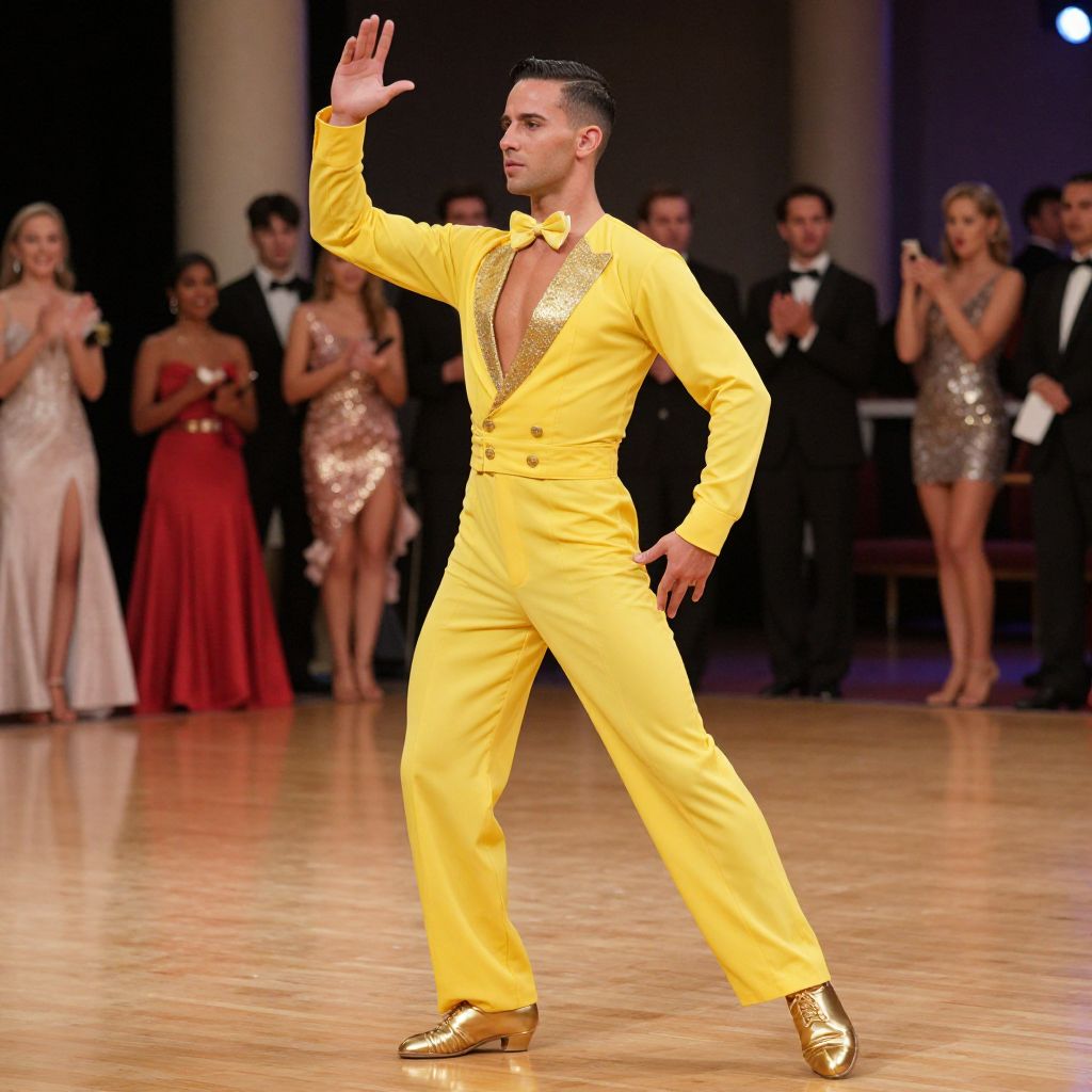 Party Dance Costume, male dancer in a yellow outfit and gold shoes