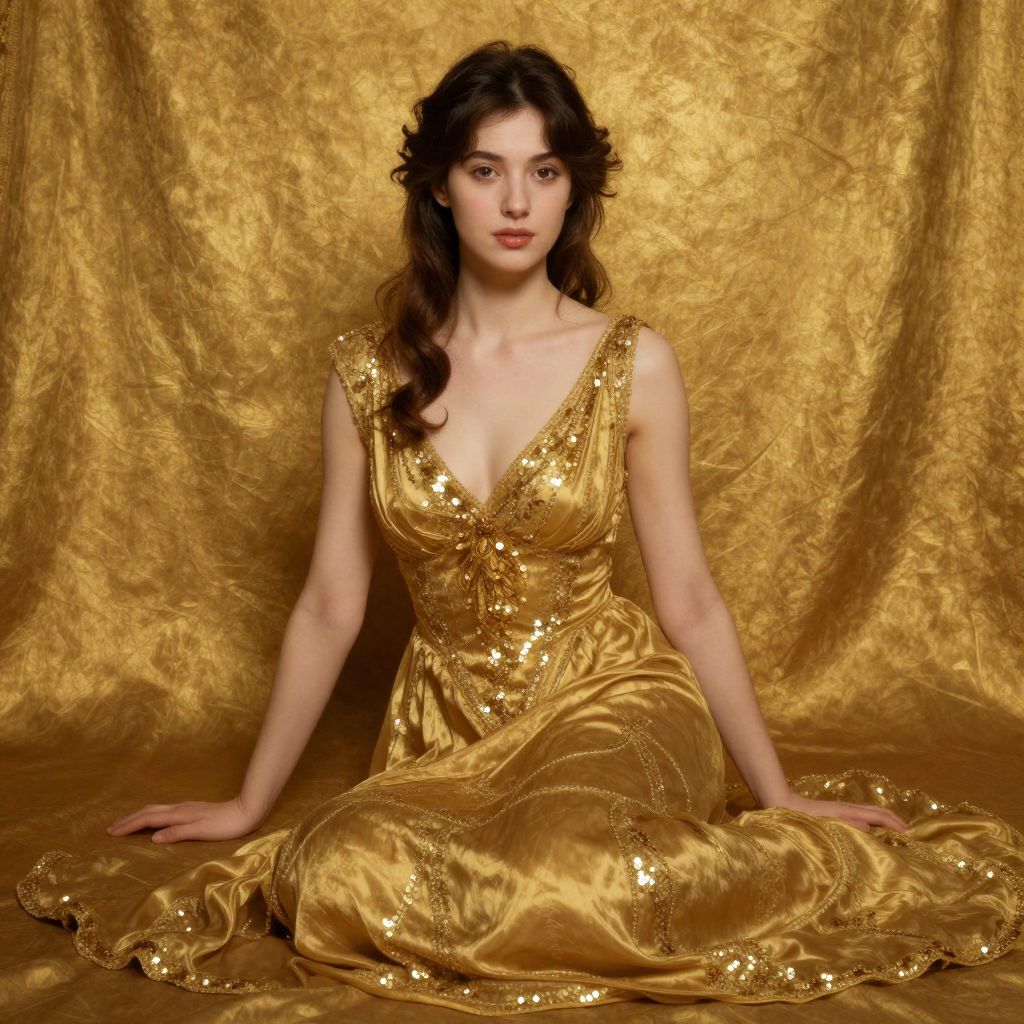 A woman in a luxurious gold dress with intricate sequin detailing sits gracefully against a richly textured golden backdrop, evoking the opulent and romantic aesthetic reminiscent of John William Godward's style, rendered in a high-definition digital art medium with dramatic lighting effects.
