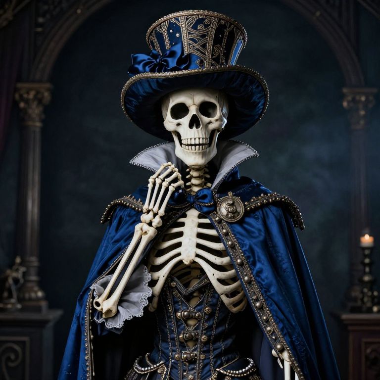 A skeletal figure dressed in ornate, Victorian-inspired attire, including a large, decorated hat and a blue cloak, stands in a dark, moody setting, evoking a circus performer or necropunk aesthetic.