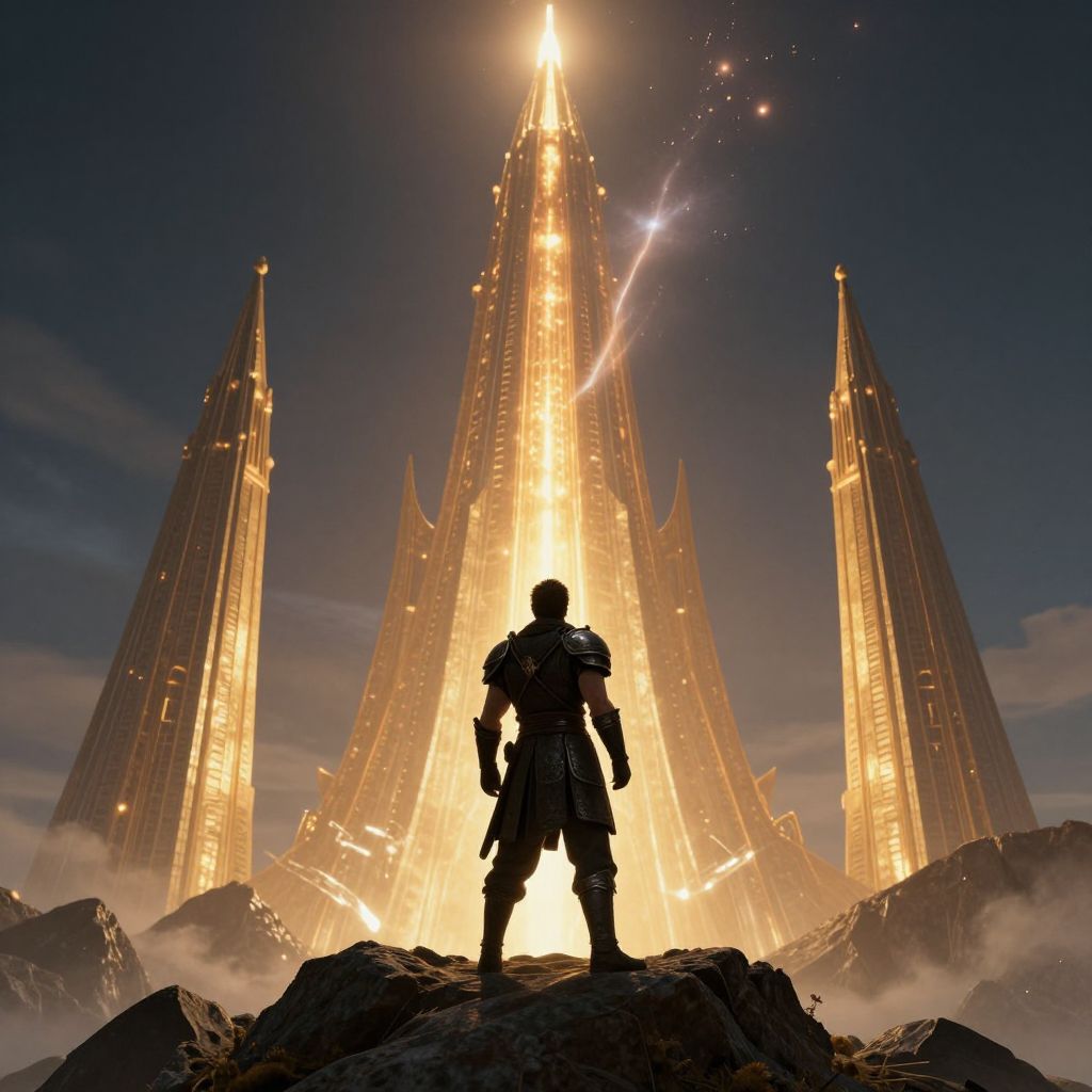 Digital artwork depicting a silhouetted, armored warrior standing on a rocky outcrop, facing a towering, illuminated skyscraper with three spires. The skyscraper is bathed in bright yellow-orange light, with a bright starburst effect near the top. The sky is dark with scattered clouds, and mist surrounds the base of the structure. The warrior's armor is detailed with sharp, angular designs, and he holds a sword at his side. The overall scene evokes a sense of awe and determination, with the towering skyscraper dominating the background.