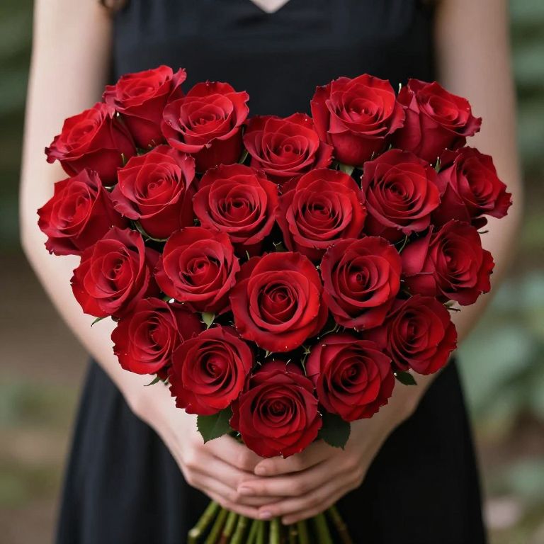 Heart-shaped bouquet of vibrant red roses held gracefully by hands, showcasing 35 meticulously arranged blooms as a romantic gesture in an Ultimate Fantasy setting.