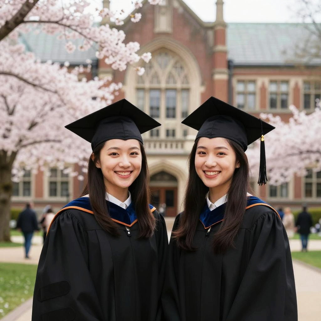 Academic gown, academic robe, mortarboard, square cap, university campus, buildings, cherry blossoms, smiling, 2girls, detailed uniform, look at viewer, (SIGMA 85mm f1.4), depth of field, bokeh, detailed photorealistic background, diffused natural sunlight, diffused natural skin glow