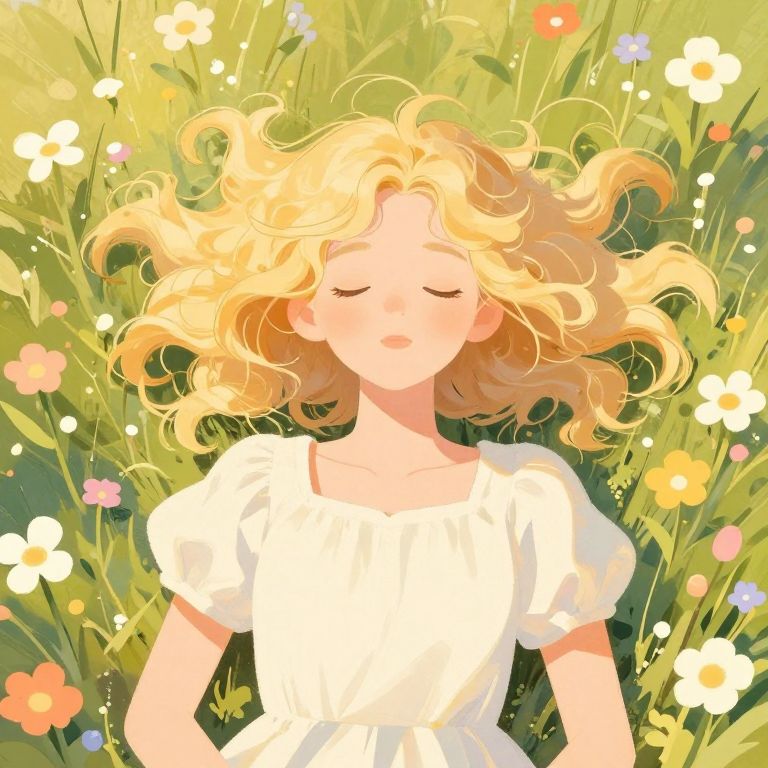 Digital illustration of a joyful, dark-haired girl with arms raised, jumping in a sunlit, flower-filled meadow under a bright blue sky with fluffy