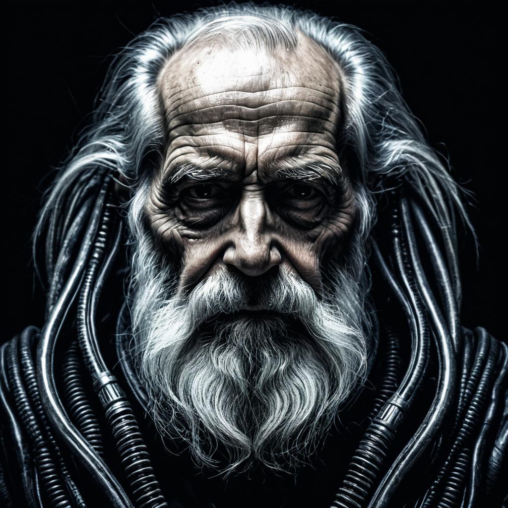 Digital artwork of an elderly man with a long white beard and deep wrinkles, surrounded by intricate tubular cybernetic structures reminiscent of H.R. Giger's style. The dark, moody background enhances the contrast, highlighting the man's intense gaze and detailed facial textures.