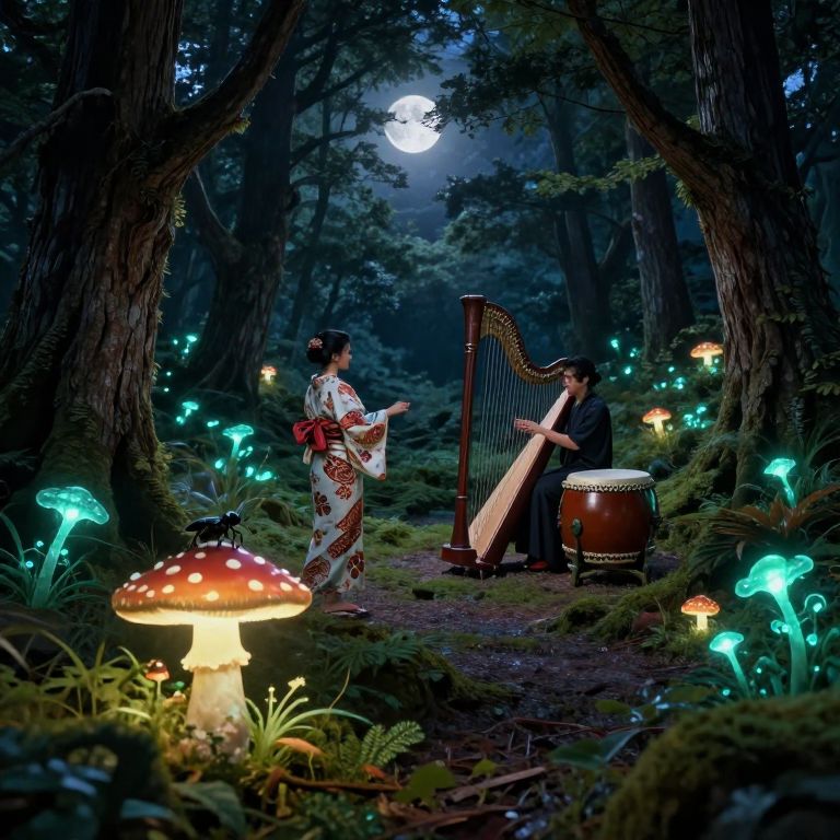 Enchanting forest moonlit scene: woman in floral kimono plays harp, man drums beside glowing mushrooms and bioluminescent plants.