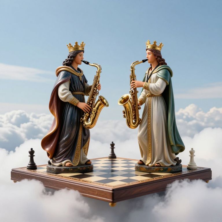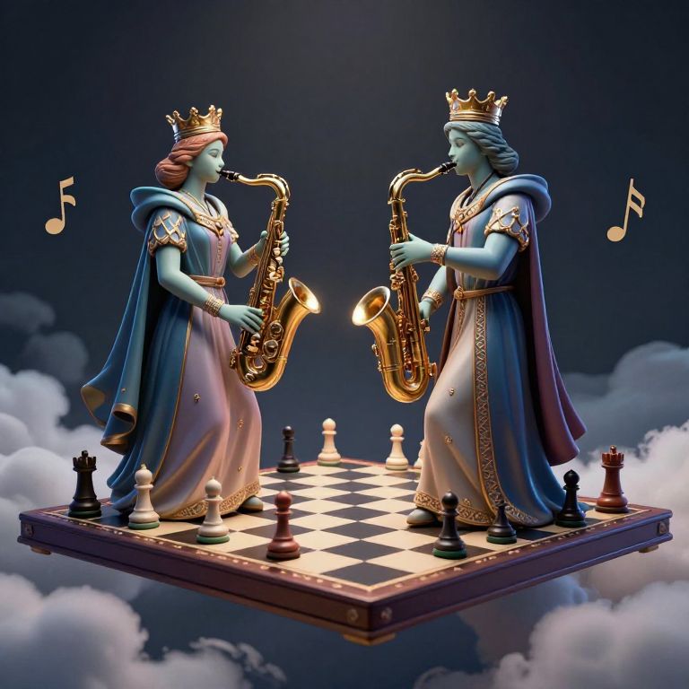 A floating chessboard is played in midair by two statues that resemble ancient rulers and a saxophone, their moves reshaping the very geometry of space.