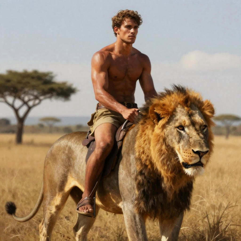 Photograph: Muscular, shirtless man with curly brown hair rides a majestic male lion in a sunlit, golden savanna, with acacia