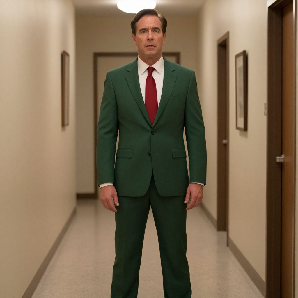 Guy Peter Griffin Costume, man in a green suit and red tie standing in a hallway