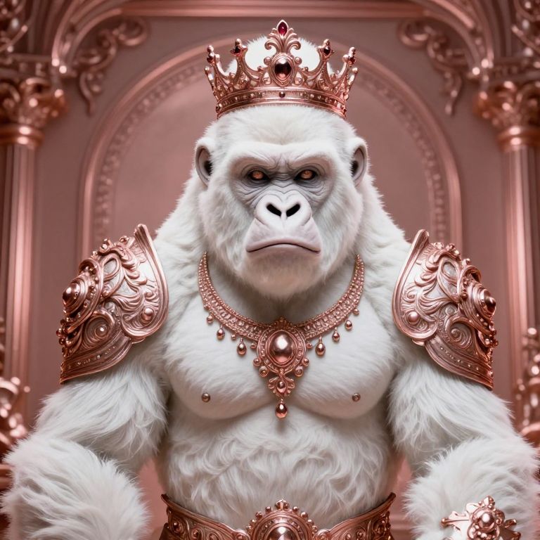 The image presents a striking interpretation of an armored white female gorilla animal queen, adorned with a crown and highly detailed, intricate, hypermaximalist, ornate, luxury, and elite attire. The gorilla's fur is white and fluffy, complemented by a crown that features rose gold accents and intricate designs, symbolizing regality and power. The attire includes a necklace with a symmetrical, elaborate design, further enhancing the character's majestic appearance. The lighting is cinematic, with rose gold hues casting a warm glow, adding to the luxurious and haunting atmosphere. The overall composition is symmetrical, with the gorilla's body and accessories arranged in a balanced manner, creating a harmonious and visually captivating scene. The image is reminiscent of the artistic styles of Ernst Haeckel, Charles Audubon, and Alphonse Mucha, blending natural elements with ornate, decorative motifs.