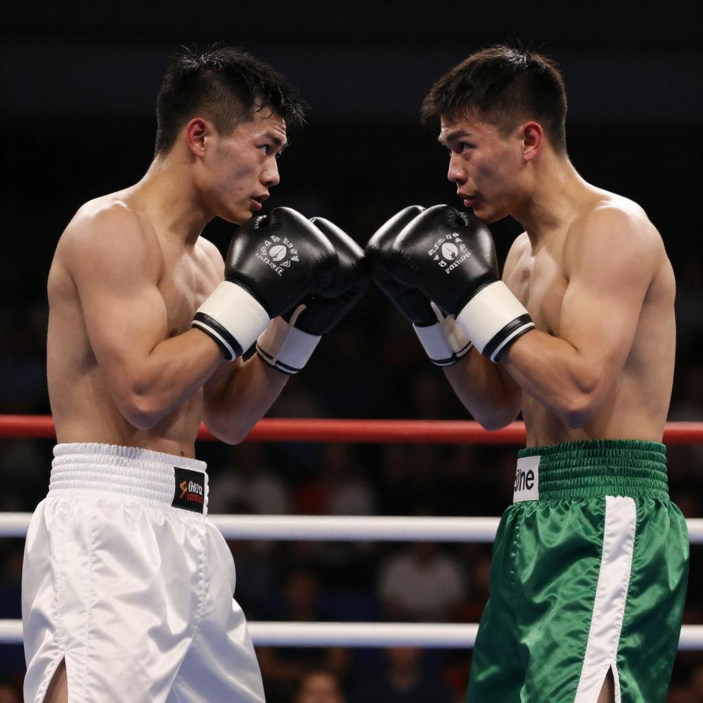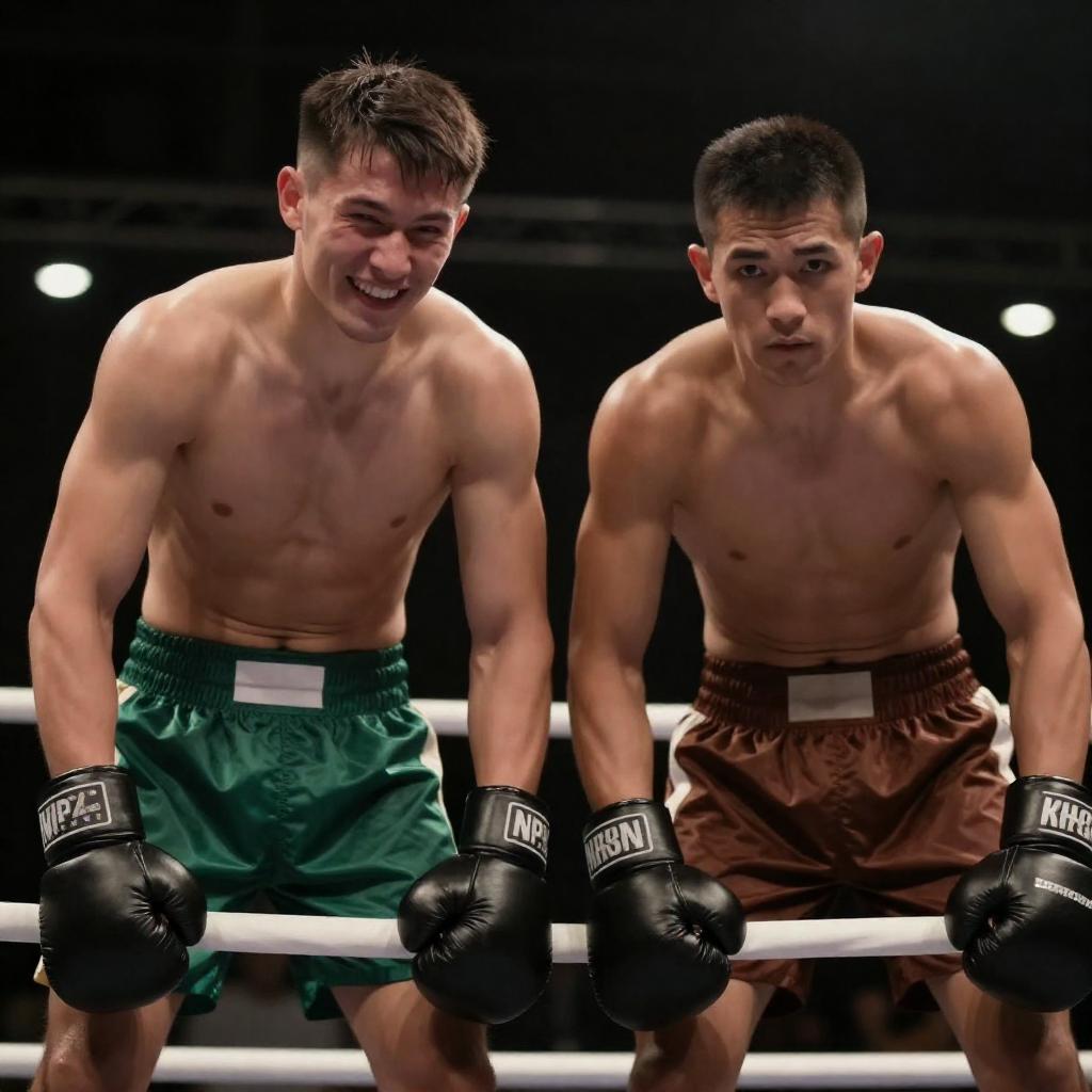 Two muscular male boxers in a ring, both shirtless, wearing black gloves and trunks. Left boxer in green shorts, right boxer in white shorts. Both poised with fists raised, facing each other. Background crowd visible. Blue and red ropes. Intense expressions.