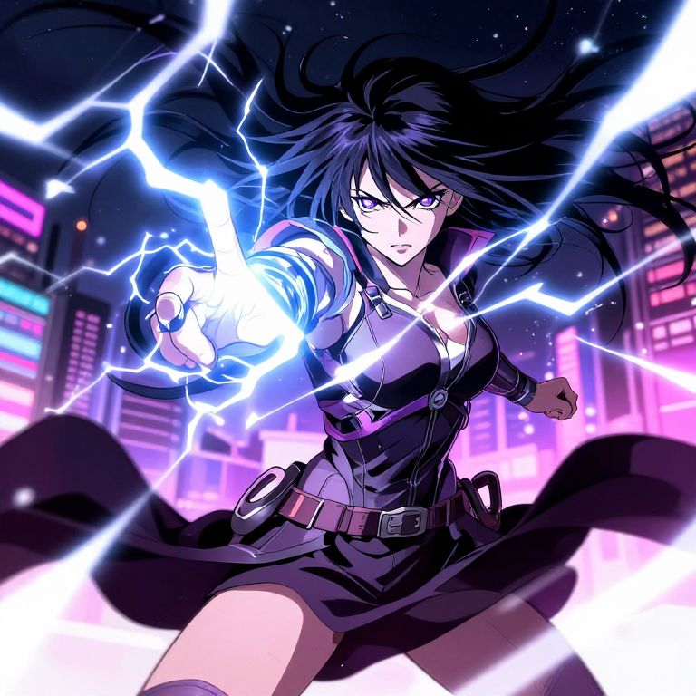 Digital anime artwork of a fierce, black-haired woman with glowing blue electricity, wearing a black dress and belt, in a neon-lit cityscape.