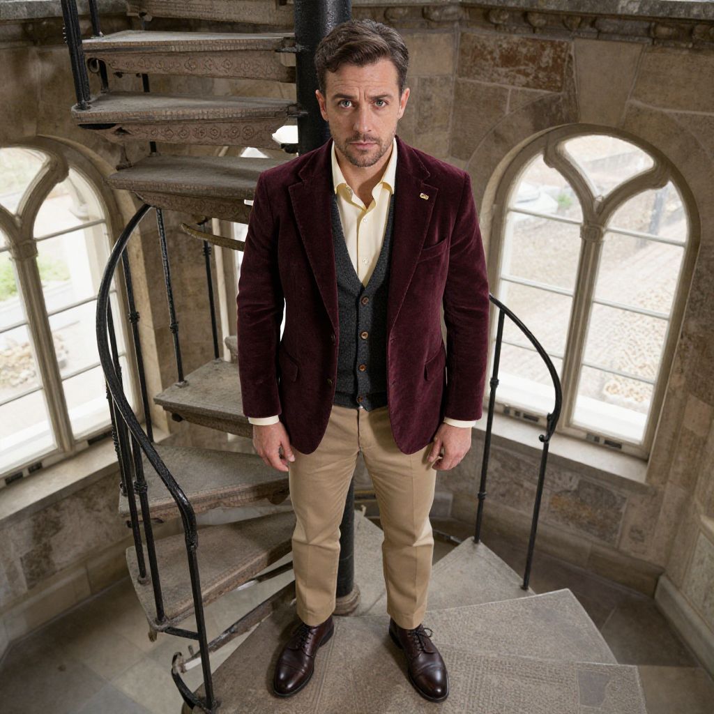 A man, burgundy velvet blazer, cream dress shirt, charcoal knit cardigan, tailored khaki trousers, dark brown leather oxfords, historic stone building, arched windows, spiral staircase with wrought iron banister, overhead shot, confident expression Man has masculine face and piercing eyes