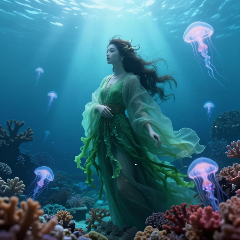 A woman wearing a flowing green and white dress stands underwater illuminated by rays of light from above. The dress fabric spreads out gracefully around her, creating ethereal, wave-like shapes in the water. The scene has a serene, mystical atmosphere with translucent green hues and bubbles surrounding her.