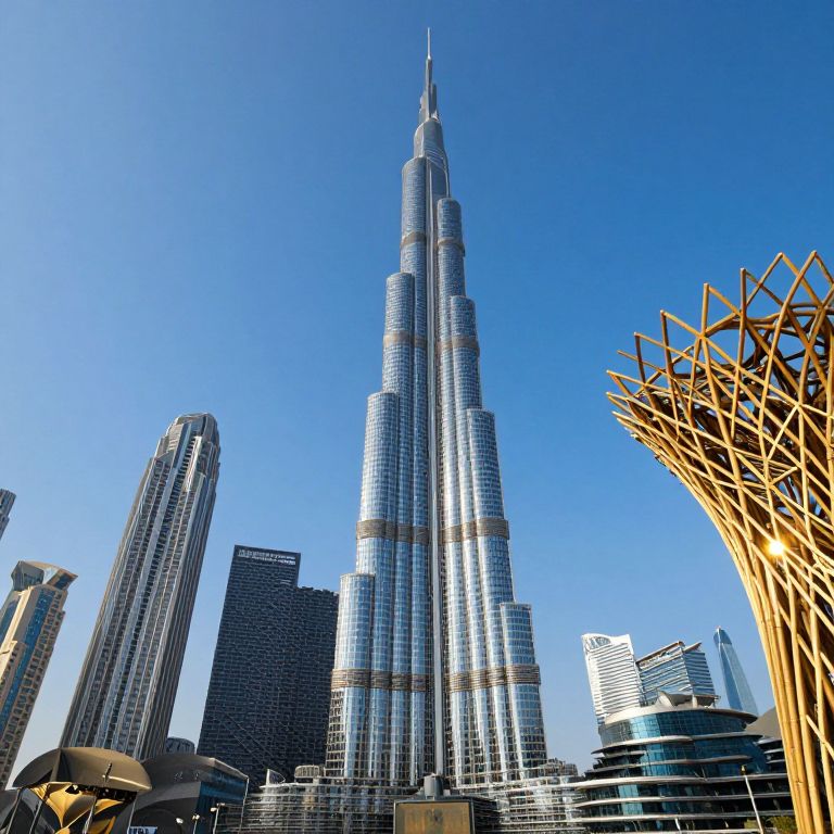 Photograph of Burj Khalifa towering over Dubai's skyline, clear blue sky, modern skyscrapers, and golden structural arches in the foreground