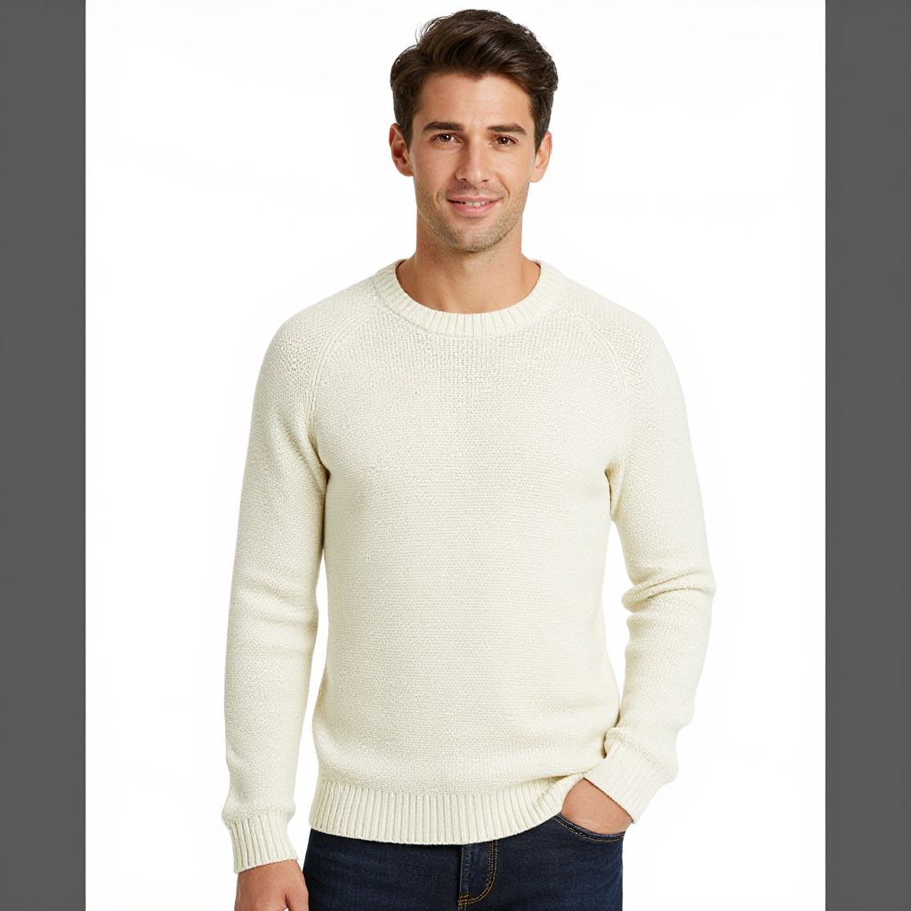 A photograph of a light-skinned man with short, dark brown hair and a slight smile. He's wearing a cream-colored, knitted sweater with a round neckline and dark blue jeans. His right hand is in his pocket, and he stands against a plain white background with gray borders on either side. The lighting is even, highlighting the texture of the sweater.