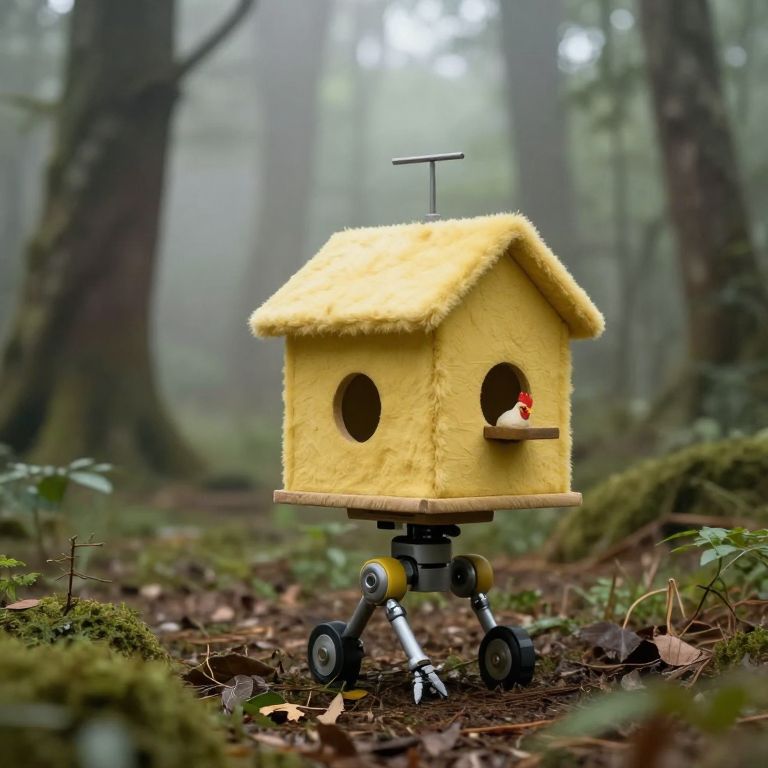 A robotic chickenhouse with a soft yellow exterior walks through a misty forest, surrounded by tall trees and a serene, eerie atmosphere.