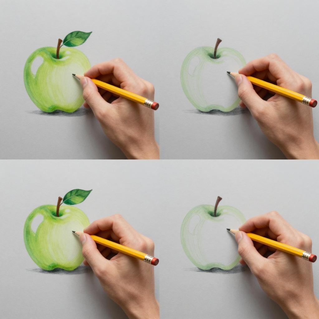 Digital illustration of hands drawing a stylized green apple with a leaf on a gray surface. Three images show the drawing process. Hands hold a yellow pencil. Apple is semi-transparent, with green and black gradients. Shadow of apple visible.